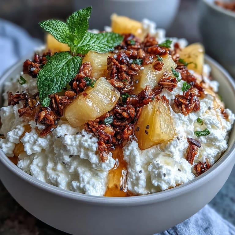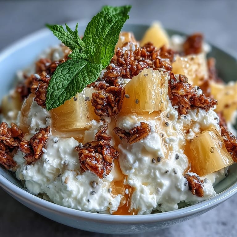 There's something about using a slightly chilled bowl that keeps everything fresher tasting, and serving immediately means you get that textural contrast that makes the bowl interesting. The way you arrange things matters too—piling everything in the middle looks intentional, whereas scattered toppings feel more casual. Temperature matters more than you'd think; if your cottage cheese comes straight from the fridge and your pineapple has been sitting out a bit, that temperature play is actually lovely against each other.