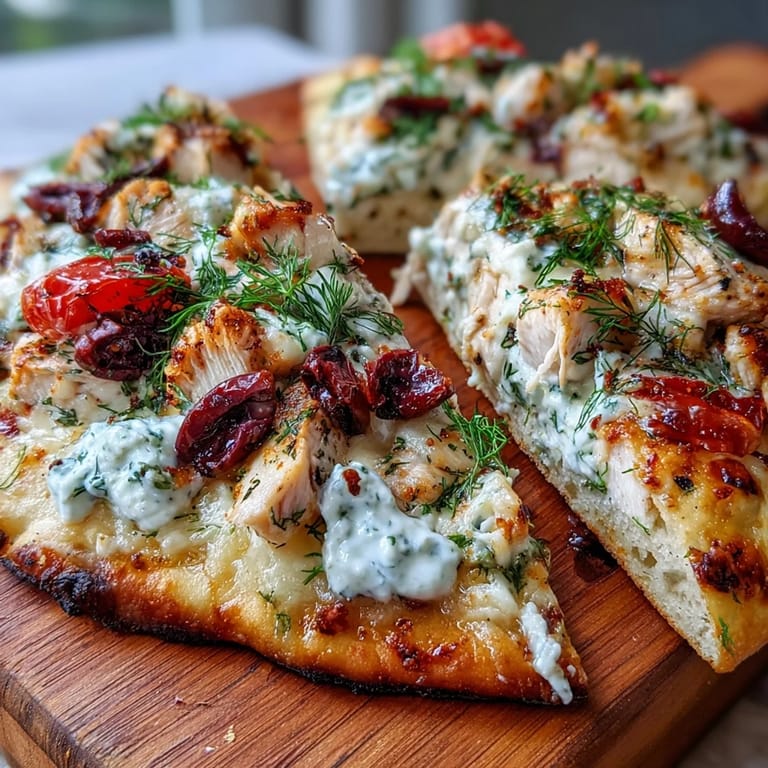 One of the best things about this pizza is how well it adapts to whatever you have on hand or whatever dietary needs you're working with on any given evening. I've made it vegetarian by substituting grilled zucchini or eggplant for the chicken, and honestly, it loses nothing in translation because the feta, olives, and vegetables are substantial enough to stand on their own. Adding a handful of fresh spinach or artichoke hearts only makes it better, giving you more substance and nutritional value without requiring any adjustments to the technique. The one thing I wouldn't change is the tzatziki drizzle; that's non-negotiable for the final result.